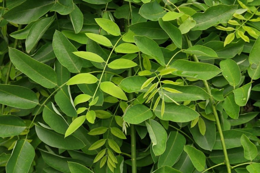 - Dalları uzun, hafif kıvrıktır. Sürgünleri parlak koyu yeşil ve az sayıdadır. Yazın yeşil yaprakları, çok sıralı sarmal dizilmiş, bileşik tek tüysü, 25 cm uzunluğunda, 7-17 yaprakçıklıdır. Yaprakçıkları eliptik oval mızrak biçimli, 5 cm uzunluğunda, kısa saplı, üst yüzü parlak yeşil tüysüz, alt yüzü mavi yeşil ve çok az tüylüdür.